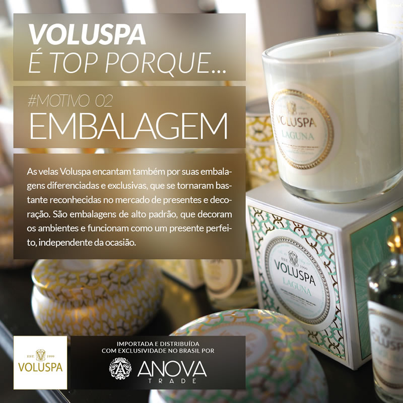 As velas Voluspa encantam também por suas embalagens diferenciadas e exclusivas, que se tornaram bastante reconhecidas no mercado de presentes e decoração. São embalagens de alto padrão, que decoram os ambientes e funcionam como um presente perfeito, independente da ocasião.