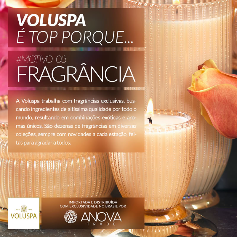 A Voluspa trabalha com fragrâncias exclusivas, buscando ingredientes de altíssima qualidade por todo o mundo, resultando em combinações exóticas e aromas únicos. São dezenas de fragrâncias em diversas coleções, sempre com novidades a cada estação, feitas para agradar a todos.