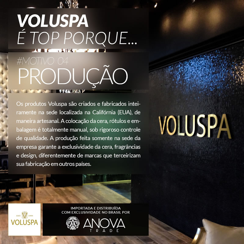 Os produtos Voluspa são criados e fabricados inteiramente na sede localizada na Califórnia (EUA), de maneira artesanal. A colocação da cera, rótulos e embalagem é totalmente manual, sob rigoroso controle de qualidade. A produção feita somente na sede da empresa garante a exclusividade da cera, fragrâncias e design, diferentemente de marcas que terceirizam sua fabricação em outros países.