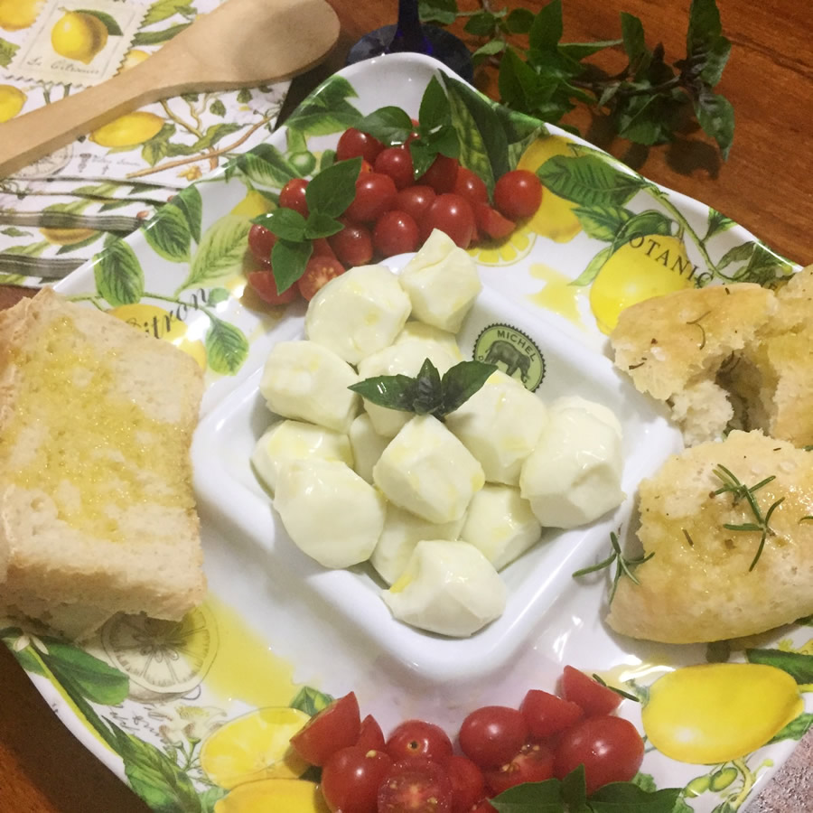 Feito isso, sirva cortando pedaços com a própria mão de forma bem rústica acompanhados de tomate cereja, mussarela de búfala e manjericão regados com azeite e sal.