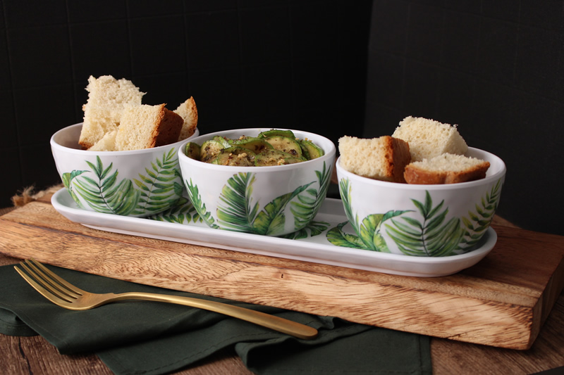 Usei o Kit Petisqueira da Coleção Flamingo da Michel Design Works, servindo os pães já cortados nas laterais e a estrela - o antepasto de abobrinha - no centro, tudo no maior estilo “antipasti” italiano! Veja mais itens da coleção Flamingo clicando aqui.