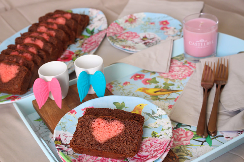 O coração feito de bolo de morango, a vela perfumada da Castelbel Porto, os pratos e a bandeja extremamente delicados formam um café da manhã afetivo carregado de amor nos detalhes.