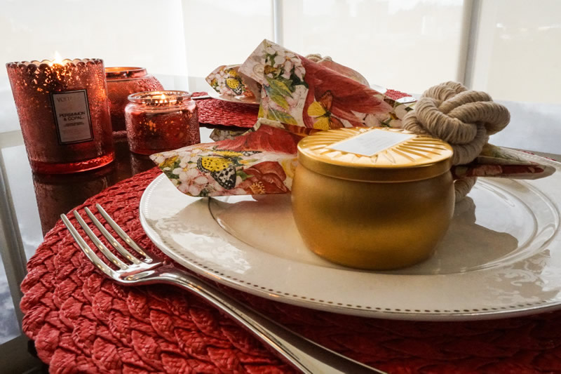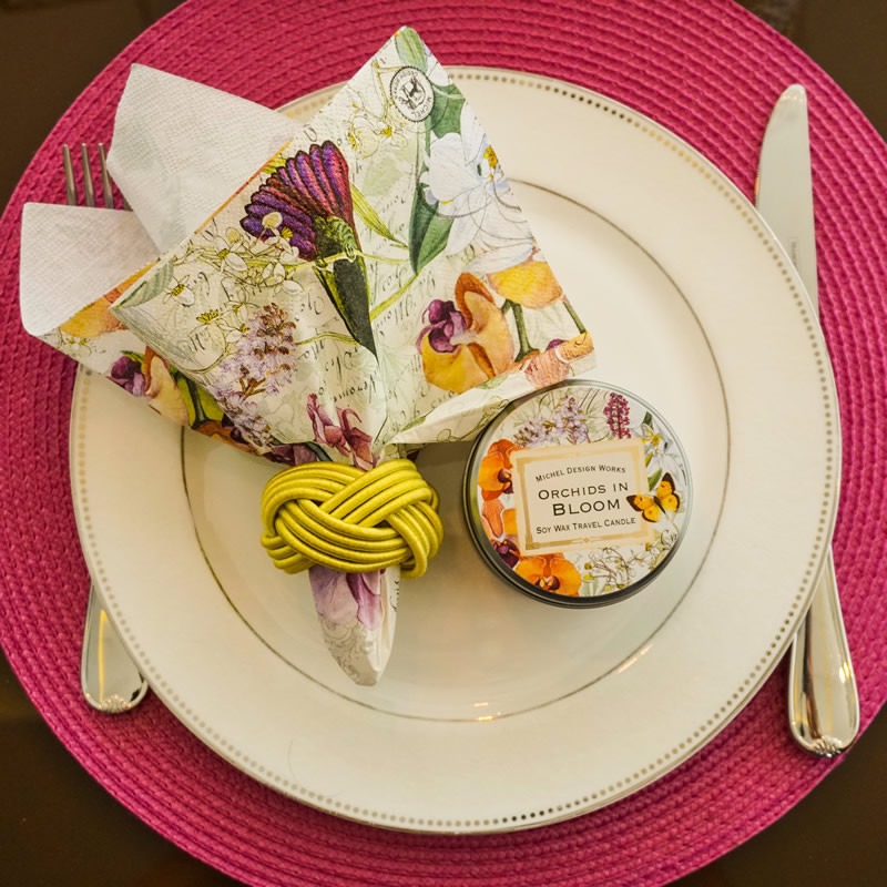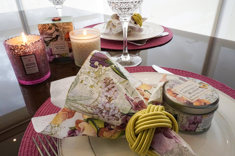 As próximas duas propostas são para mesas de almoço, que neste dia podem ser decoradas com peças e cores bem femininas. Sugerimos as estampas Orchids in Bloom e Morning Blossom, da Michel Design Works e as velas Japanese Plum Bloom e Persimmon & Copal, da VOLUSPA.