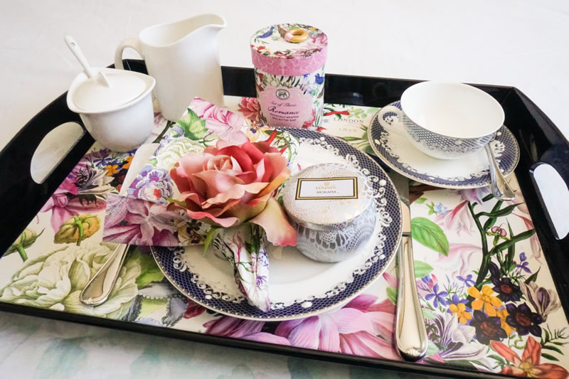 Se você ainda mora com a sua mãe ou tem a oportunidade de estar com ela bem cedinho, que tal arrumar uma bandeja de café da manhã e levar na cama? Com certeza ela vai achar o máximo! Nesta proposta usamos guardanapos e bandeja Romance, da marca Michel Design Works e a vela Mokara, da VOLUSPA.