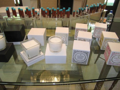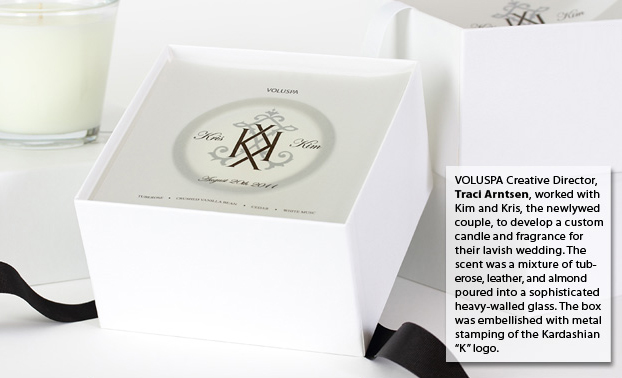 Kim Kardashian é uma modelo, socialite e atriz norte-americana, famosa pelo reality show que protagoniza com sua família, Keeping Up with the Kardashians. Para seu casamento com Kris Humphries em maio de 2011, a Voluspa criou velas especiais para serem dadas de lembrancinha para os convidados.